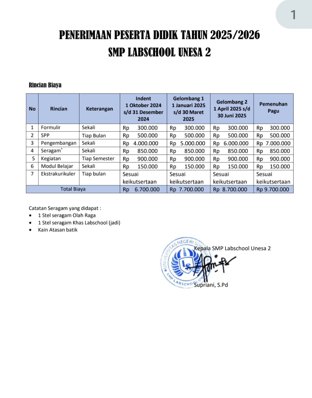 Rincian BIaya Pendaftaran Siswa baru th 2025 - 2026